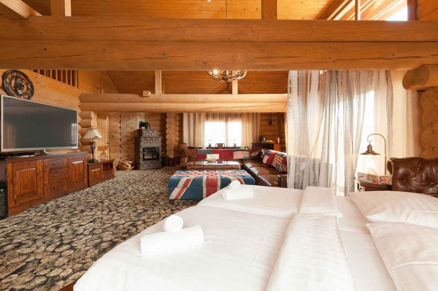 Luxusný Apartmán Suita Executive s rozlohou 110 m² je ideálnou voľbou pre tých, ktorí hľadajú priestranné a elegantné ubytovanie s maximálnym komfortom. Tento apartmán je skutočným symbolom pohodlia a štýlu, vybavený modernými a kvalitnými doplnkami. S veľkou obývacou časťou, krbom a dvoma kúpeľňami je tento apartmán ideálny pre rodiny alebo skupiny, ktoré si chcú užiť pobyt v súkromí a luxuse. Balkóny ponúkajú nádherný výhľad na hory, ktorý umocňuje atmosféru relaxácie.