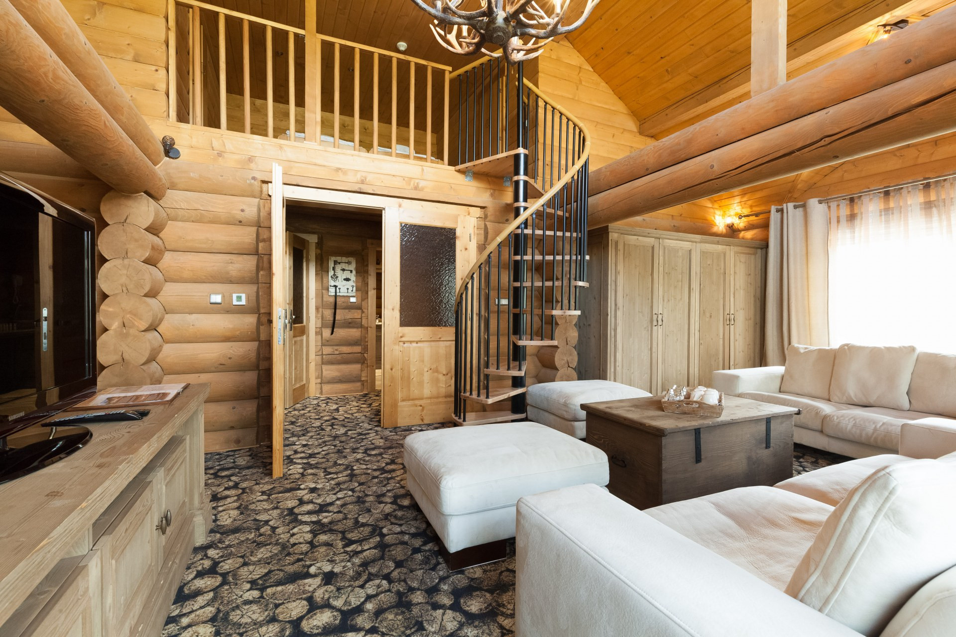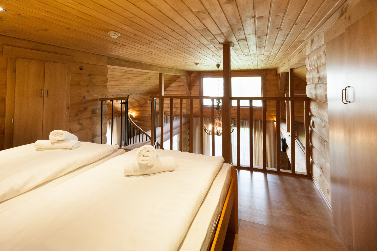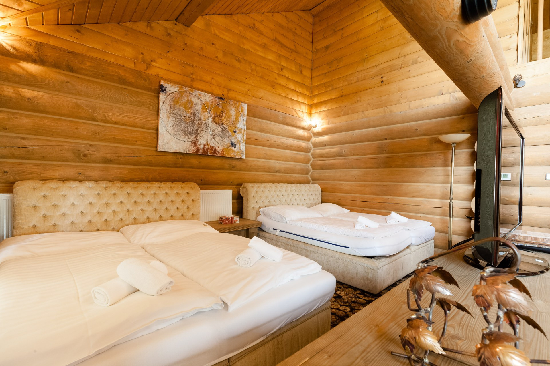 Naša priestranná dvojúrovňová suita je ideálnym miestom pre rodiny alebo skupiny priateľov, ktorí hľadajú pohodlie a luxus. S rozlohou 70 m² poskytuje dostatok priestoru ideálne pre 4 až 6 osôb. Unikátnym prvkom tejto izby je loggia, kde sa nachádza jedna z dvojlôžkových postelí, čím získate extra priestor. Z apartmánu si môžete vychutnať úchvatný výhľad na hory, ktorý vám spríjemní pobyt a môžete ho obdivovať priamo z izby.