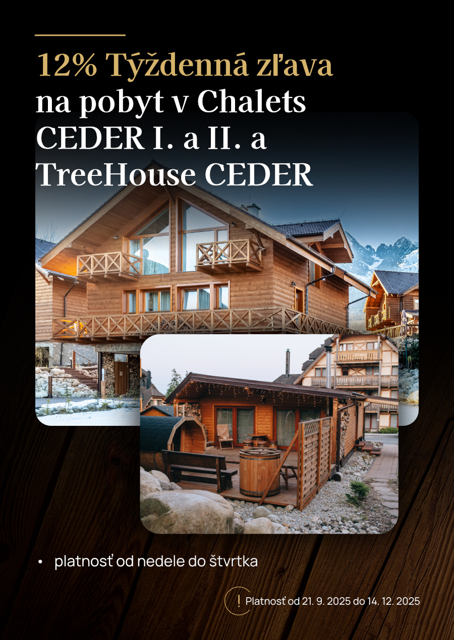 Týždenná 12% zľava na ubytovanie v Chalets CEDER I.a II. a Treehouse CEDER